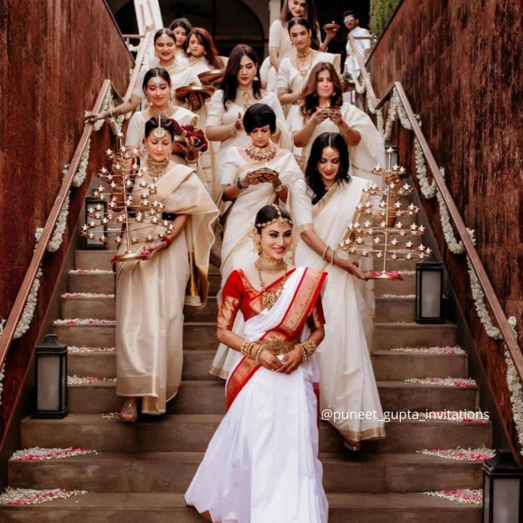 Opting for a white clad saree, Mouni Roy looked like a true South Indian bride. We just can’t keep our eyes off of her. And absolutely loved how all the guests had colour coordinated outfits making the wedding look even more surreal and serene to watch. Here’s all the exclusive pictures from the wedding.